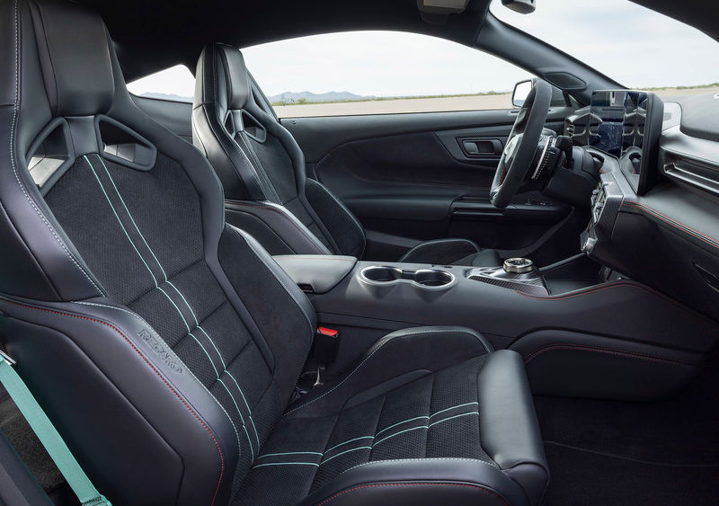 No cockpit, o Dark Horse SC exibe o volante de base chata revestido em couro do Mustang GTD, com controles de performance e detalhes em Alcantara e fibra de carbono. Bancos esportivos opcionais Recaro em couro e Dinamica – material ecológico premium – estão inclusos no Track Pack, com detalhes em cinza ou azul-esverdeado (Teal) e uma tampa no lugar dos bancos traseiros.